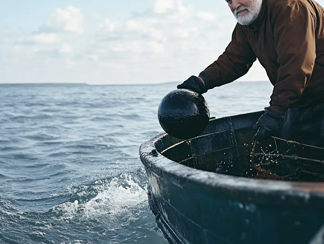 As he shifted its weight, a sudden wet pop broke the silence. The mass sagged slightly, and a rush of thick, dark fluid exploded from a seam—coating his hands and forearms in a heavy splash. It spattered onto the deck, then dripped down the hull in slow, syrupy trails.